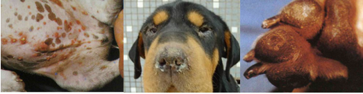 ⑤皮肤:(A)皮疹:幼犬化脓性皮炎;貂可在鼻、唇、趾掌出现水泡。身体皮肤发炎,有糠麸样皮屑脱落。(B)鼻端角质化。(C)硬足底病。